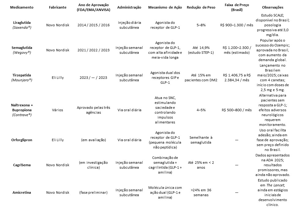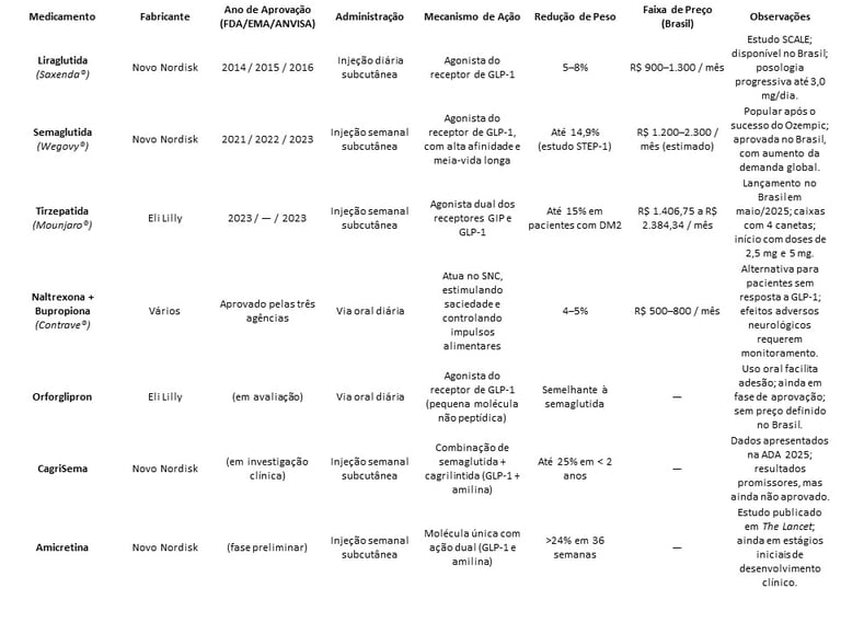 A tabela a seguir reúne os principais medicamentos aprovados ou em desenvolvimento para o tratamento da obesidade. São apresentadas informações sobre o fabricante, ano de aprovação (quando disponível), forma de administração, mecanismo de ação, eficácia na redução de peso e a faixa de preço estimada no Brasil. Essa visão comparativa ajuda a entender as diferenças entre as terapias, suas inovações e o potencial impacto clínico e econômico no cuidado com a obesidade.