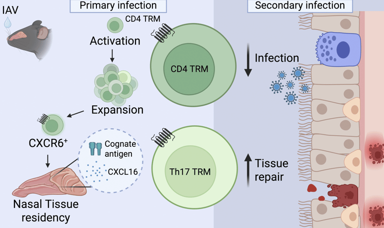 A infecção pelo vírus influenza A continua sendo um importante problema de saúde pública, em parte devido à variabilidade antigênica das proteínas de superfície, o que limita a eficácia das vacinas sazonais. Nesse contexto, as células T de memória têm ganhado destaque por reconhecerem proteínas virais mais conservadas, permitindo respostas imunes cruzadas. Entre elas, as células T de memória residentes em tecidos (TRM) atuam como uma primeira linha de defesa nos locais de entrada do patógeno. Embora o papel das TRM pulmonares seja relativamente bem estabelecido, sua função no trato respiratório superior, especialmente na mucosa nasal, principal porta de entrada do vírus, ainda era pouco compreendida.