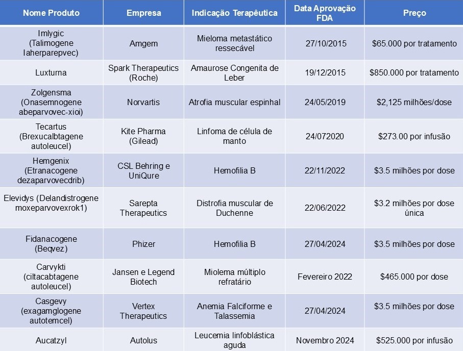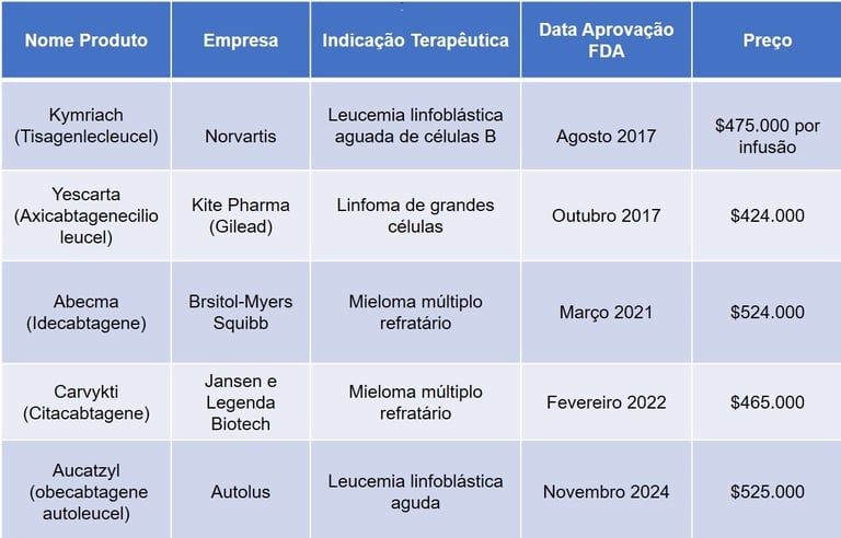 Os dados das tabelas 1 e 2 abaixo mostram um número expressivo de medicamentos aprovados pela FDA baseados em terapias avançadas nos últimos 10 anos. Foram 5 medicamentos baseados em terapia CAR-T e 9 medicamentos baseados em terapias gênicas e celulares. Chama a atenção o fato comum a todas as classes de medicamentos aprovados pela FDA - seus custos são muito elevados - impossíveis de serem custeados pelos pacientes ou mesmo para a maioria dos seguros e sistemas de saúde pública.