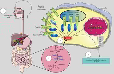 A suplementação de colina aumentou a produção de TMA e melhorou o metabolismo. Contudo, quando a síntese de TMA foi bloqueada por antibióticos ou pelo inibidor DMB, esses efeitos desapareceram, indicando que a TMA é o verdadeiro agente ativo.