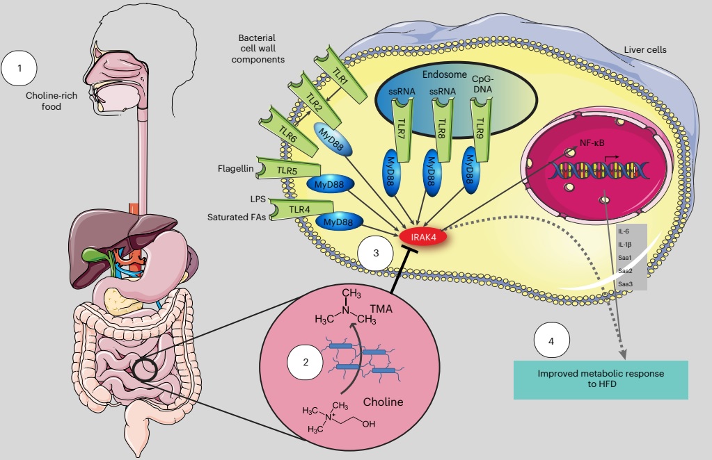 Esses achados foram reforçados por modelos genéticos e farmacológicos: camundongos deficientes em IRAK4 e animais tratados com um inibidor de IRAK4 apresentaram melhora metabólica semelhante à induzida pela TMA.