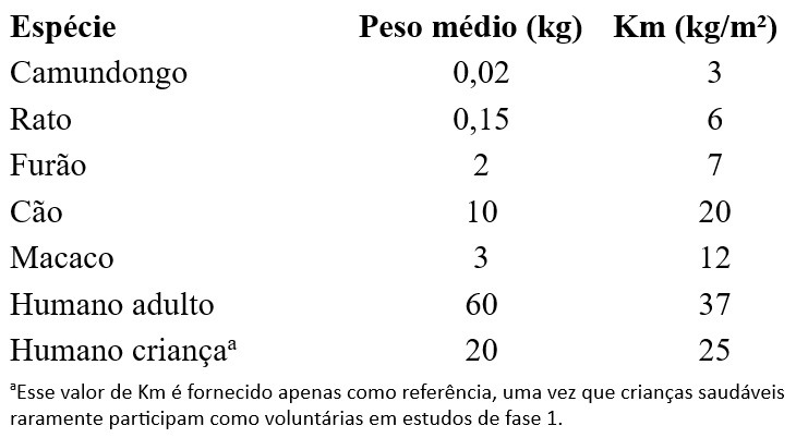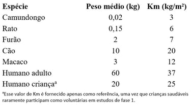 Com base nesses princípios, a extrapolação de doses de animais para humanos é feita ajustando-se a dose em mg/kg dos animais pela razão dos fatores Km (peso corporal / área de superfície corporal) fornecidos em guias regulatórios, como o da FDA.